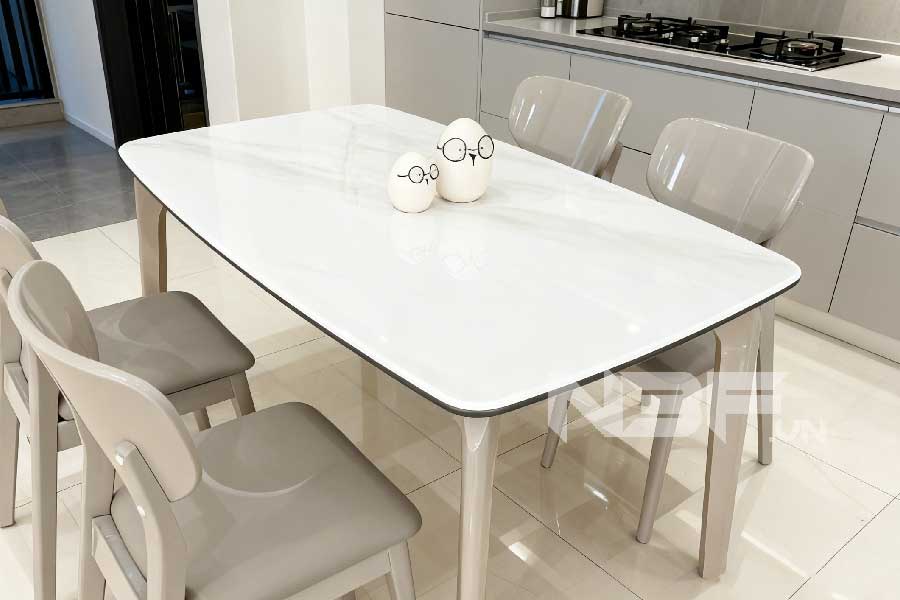 – Mặt đá nhân tạo – đẹp và dễ vệ sinh, có khả năng chống thấm ố, lau chùi nhanh chóng sau khi sử dụng. Tạo điểm nhấn cho bộ bàn ăn