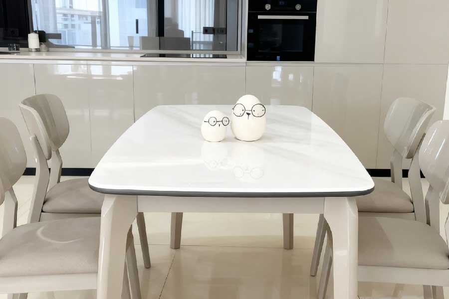 Sự kết hợp giữa mặt đá nhân tạo cao cấp và khung gỗ sồi tự nhiên được phủ sơn acrylic công nghệ cao cấp sáng bóng không chỉ mang lại độ bền vượt trội mà còn tạo nên vẻ đẹp tinh tế, sang trọng cho không gian phòng ăn.